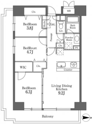 | 所在階/向き | 9階/東 | 間取り | 3LDK+WIC |